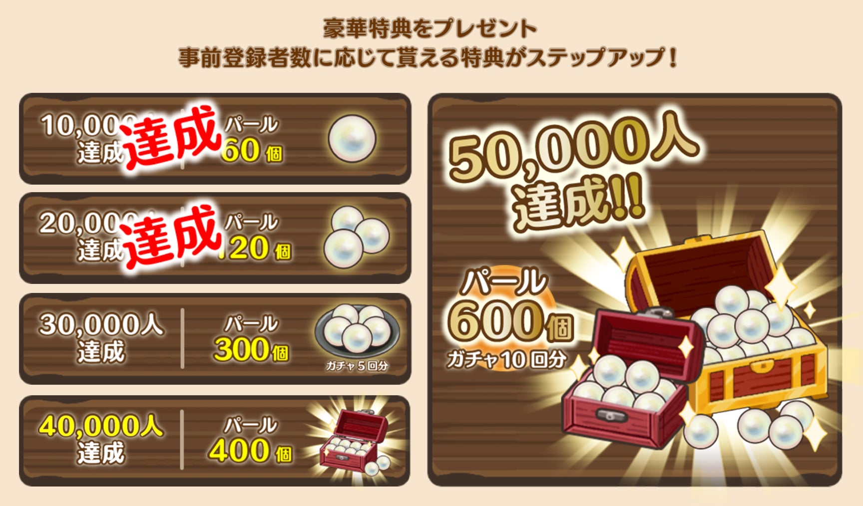 事前登録者数に応じてゲーム内でガチャが引けるアイテムを全員にプレゼントいたします。