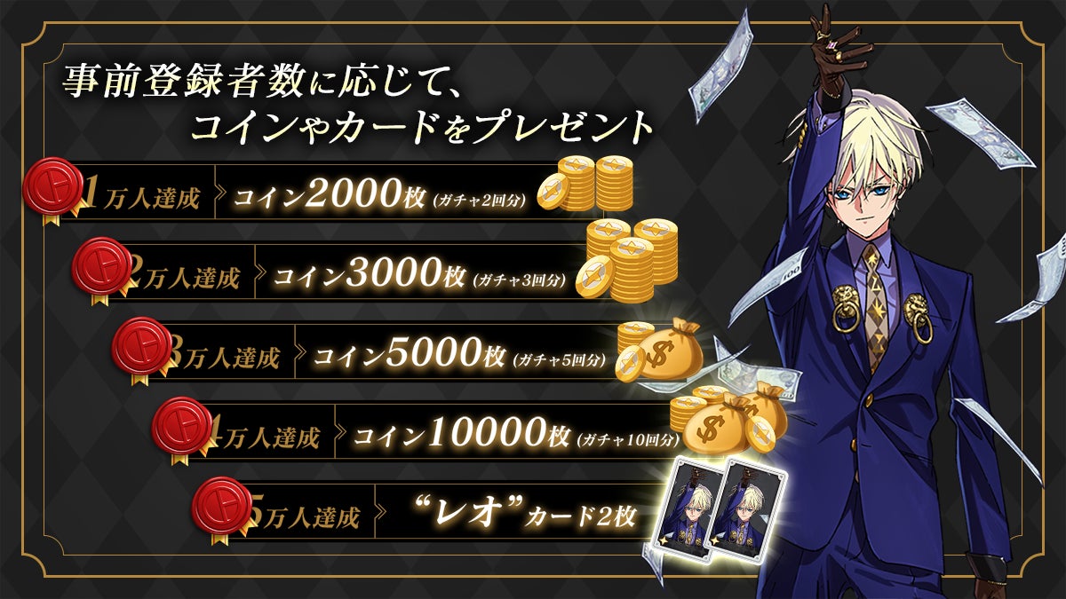 事前登録者数が5万人を突破しましたので、ゲームをプレイするみなさまに登録者数に応じたコインやカードをプレゼントいたします。
