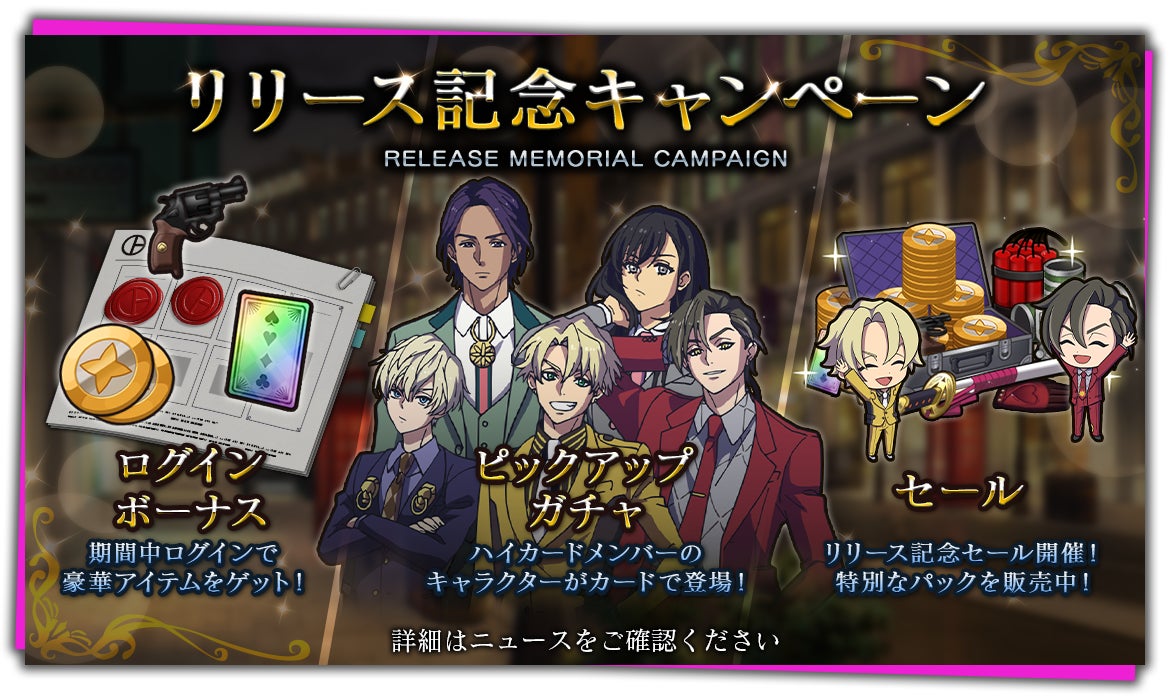 アニメ『HIGH CARD』が好きな方はもちろん、誰にでも気軽に楽しんでいただけるゲームです。リリースを記念した各種キャンペーンの開催や事前登録報酬をプレゼントしています。