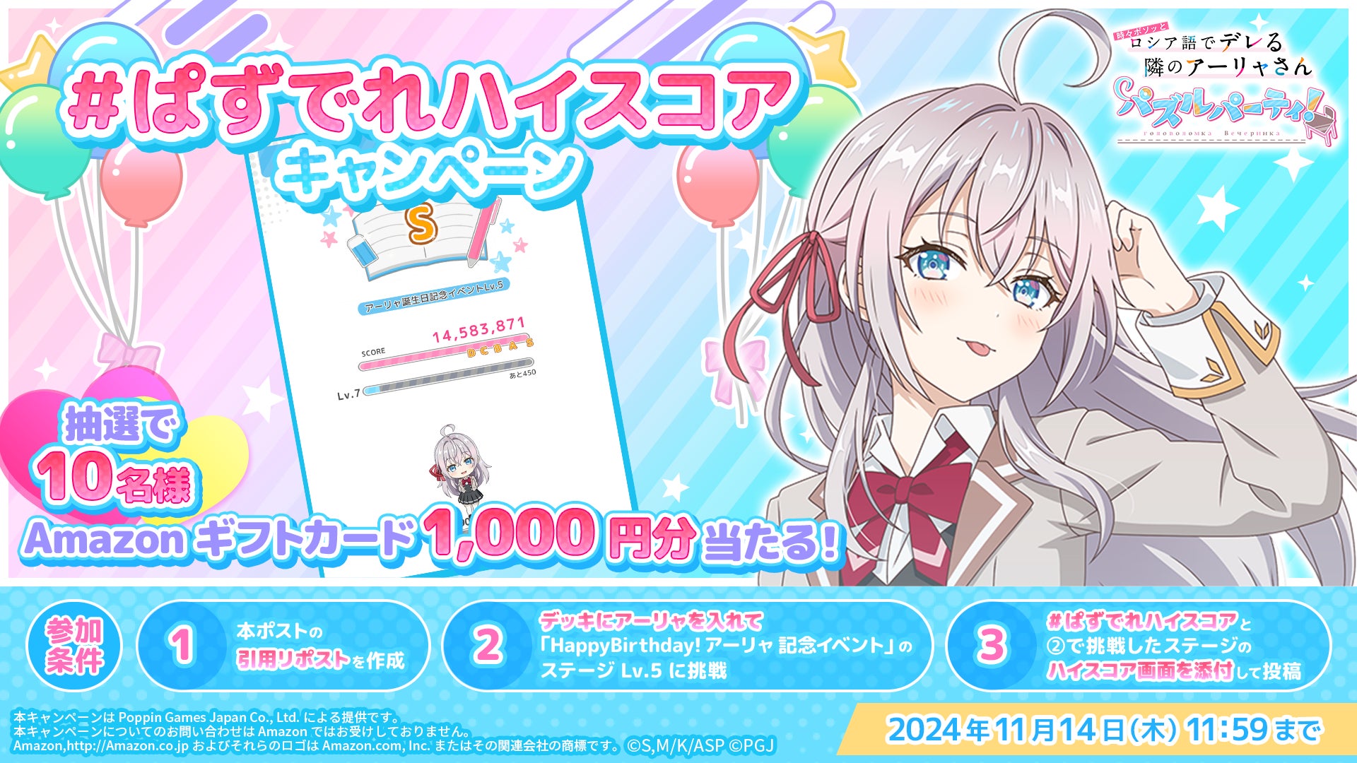 ポッピンゲームズジャパン株式会社(本社:東京都港区、代表取締役 CEO:谷口祐一郎)の開発・運営する、TVアニメ「時々ボソッとロシア語でデレる隣のアーリャさん」初のスマートフォン向けアプリゲーム『時々ボソッとロシア語でデレる隣のアーリャさん パズルパーティ!』(略称:ぱずでれ)は、2024年11月7日(木)よりアリサ・ミハイロヴナ・九条の誕生日を記念し「HappyBirthday! アーリャ 記念イベント」を開催しました。またゲーム公式Xでは「#ぱずでれハイスコア キャンペーン」を同時開催いたしました。