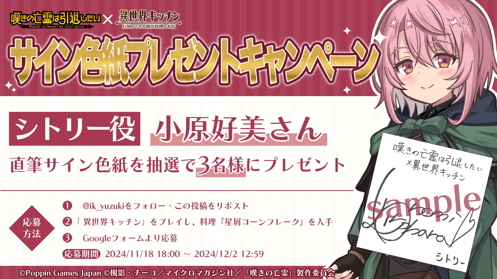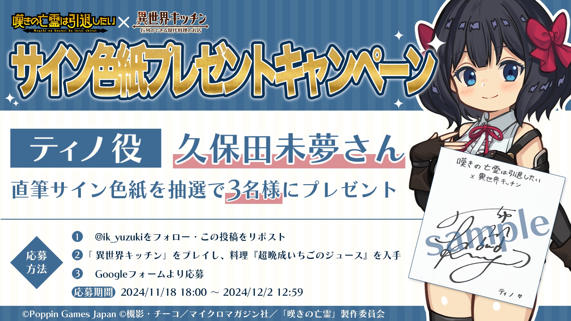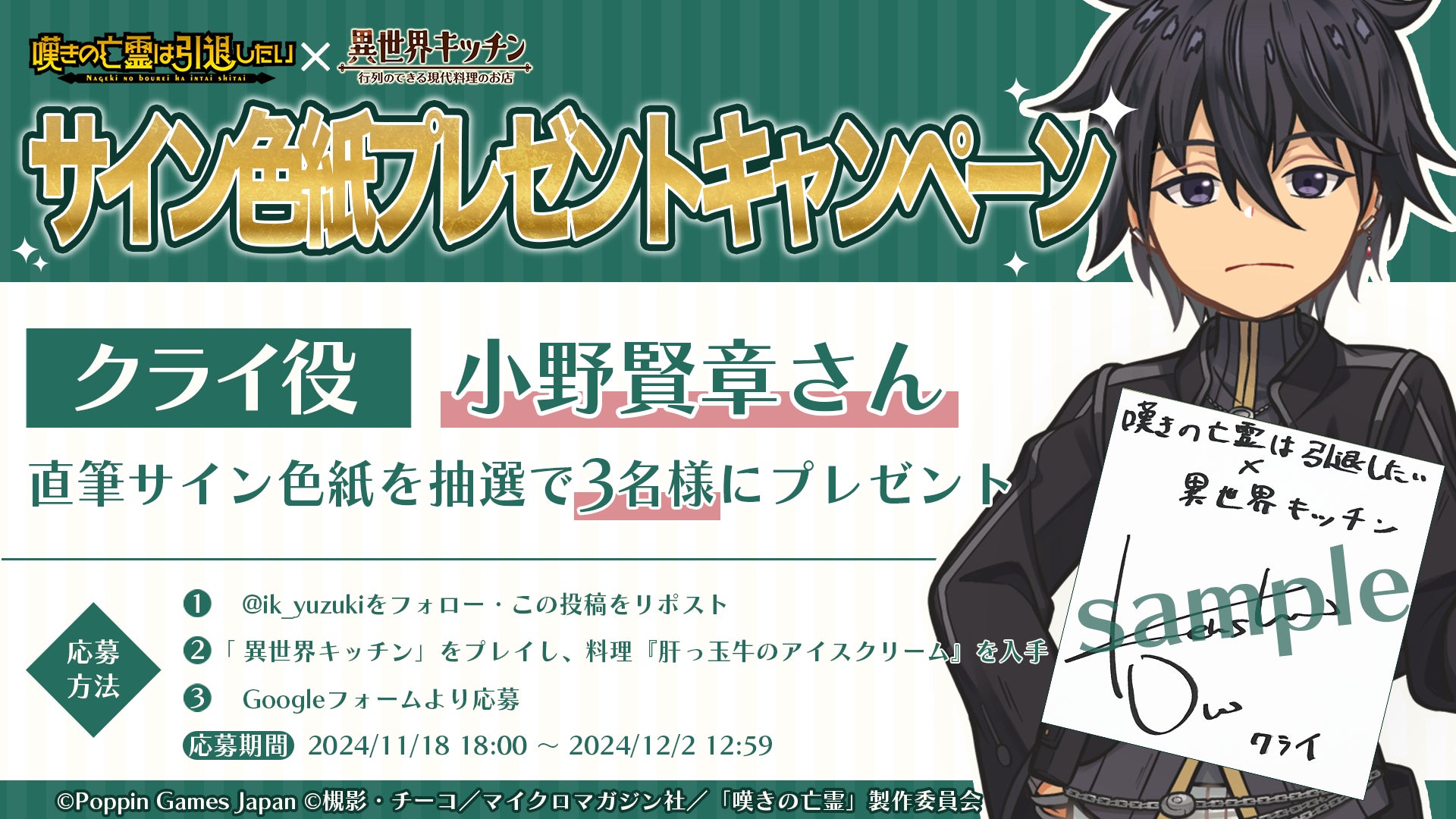 ポッピンゲームズジャパン株式会社が開発する、Android/iOS 向け完全新作スマートフォンゲーム『異世界キッチン 行列のできる現代料理のお店』は、TV アニメ『嘆きの亡霊は引退したい』とのコラボイベント開催を記念して、公式X(旧Twitter)アカウントにて、11月18日(月)より「サイン色紙プレゼントキャンペーン」を開催いたします。