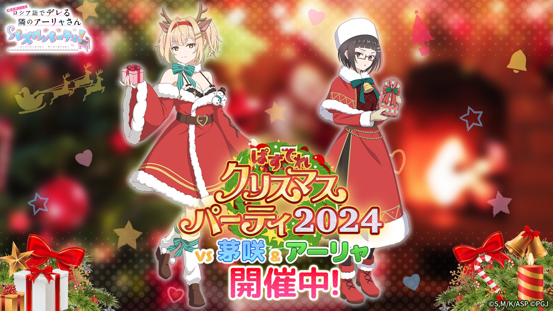 ポッピンゲームズジャパン株式会社(本社:東京都港区、代表取締役 CEO:谷口祐一郎)の開発・運営する、TVアニメ「時々ボソッとロシア語でデレる隣のアーリャさん」初のスマートフォン向けアプリゲーム『時々ボソッとロシア語でデレる隣のアーリャさん パズルパーティ!』(略称:ぱずでれ)では、2024年12月8日(日)よりイベント「ぱずでれクリスマスパーティ2024 VS 茅咲&アーリャ」を開催します。同時開催されるイベント特効勧誘では、クリスマス衣装を着たキャラクターが登場します。