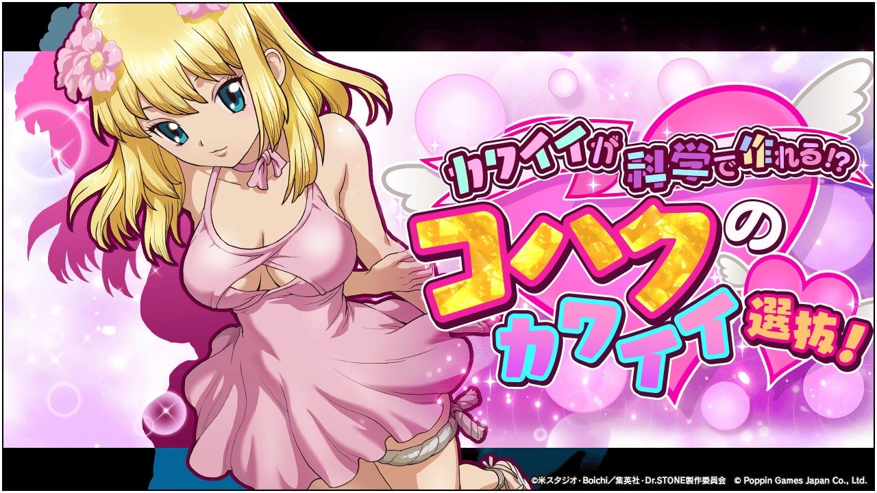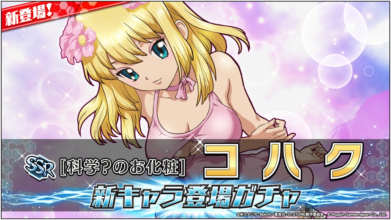ポッピンゲームズジャパン株式会社は、AppStore/GooglePlayで配信中の『Dr.STONE バトルクラフト』にて新キャラ登場ガチャ及び期間限定イベントを開催したことをお知らせいたします。