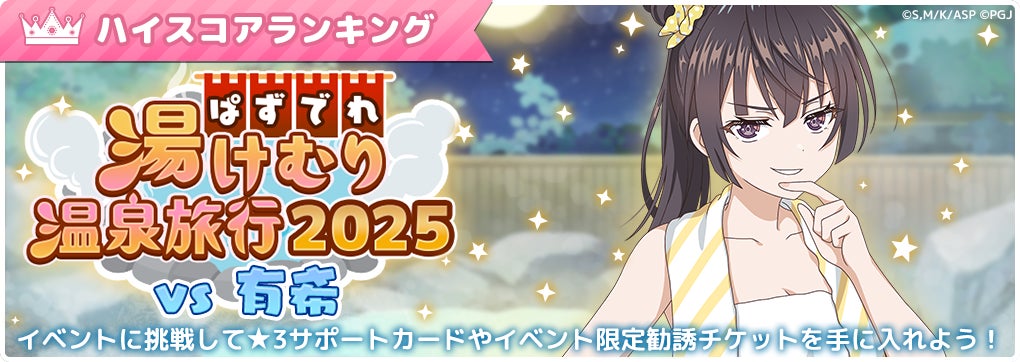 ピックアップされたキャラクターを編成することで、同時開催中の「ぱずでれ湯けむり温泉旅行2025 VS有希」を有利に進めることができるボーナス効果が付与されます。温泉姿の衣装を着たキャラクターの姿をぜひお楽しみください!