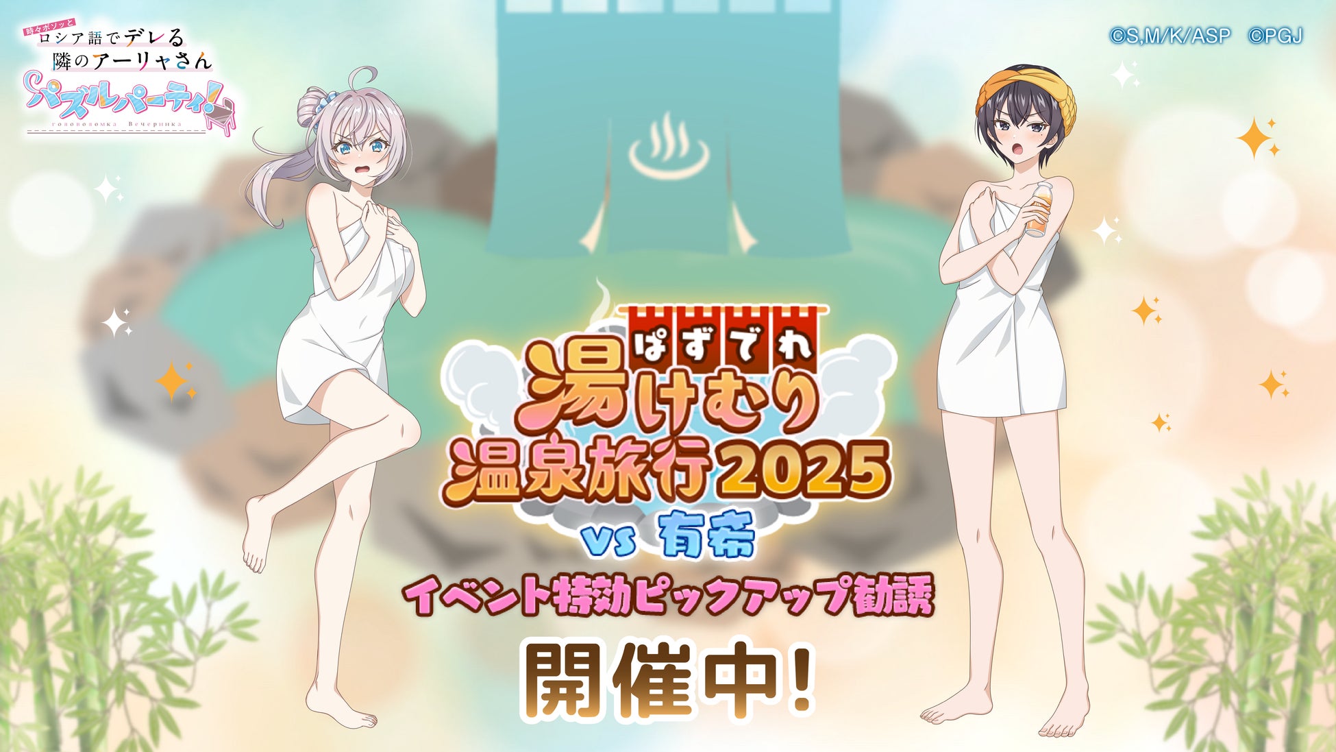ポッピンゲームズジャパン株式会社(本社:東京都港区、代表取締役 CEO:谷口祐一郎)の開発・運営する、TVアニメ「時々ボソッとロシア語でデレる隣のアーリャさん」初のスマートフォン向けアプリゲーム『時々ボソッとロシア語でデレる隣のアーリャさん パズルパーティ!』(略称:ぱずでれ)では、2025年3月3日(月)より「ぱずでれ湯けむり温泉旅行2025」を開催しました。イベント特効勧誘では、温泉姿の衣装を着たキャラクターが登場します。
