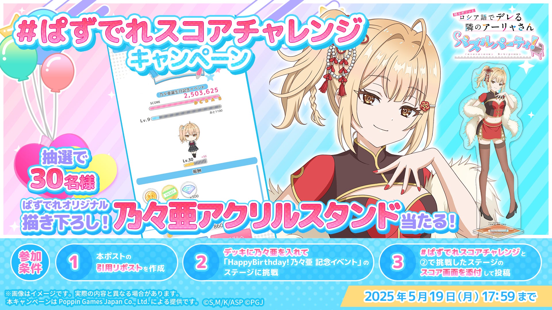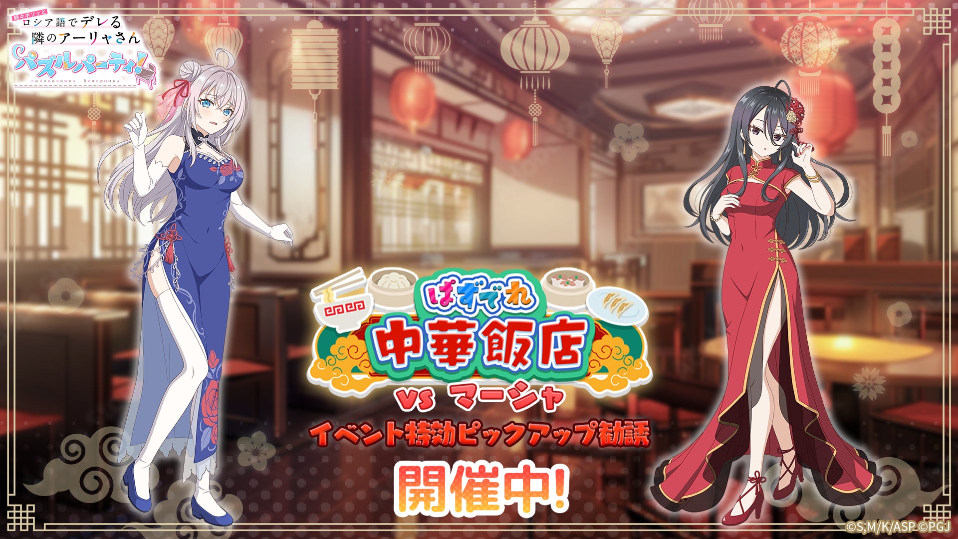 ポッピンゲームズジャパン株式会社(本社:東京都港区、代表取締役 CEO:谷口祐一郎)の開発・運営する、TVアニメ「時々ボソッとロシア語でデレる隣のアーリャさん」初のスマートフォン向けアプリゲーム『時々ボソッとロシア語でデレる隣のアーリャさん パズルパーティ!』(略称:ぱずでれ)で、2025年5月11日(日)よりイベント「ぱずでれ中華飯店VS乃々亜」を開催しました。同時開催されたイベント特効勧誘では、チャイナドレスを着たキャラクターが登場し、期間限定の勧誘や限定イベントも行いました。