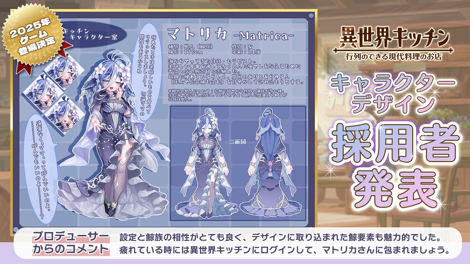 今回の募集で採用されたキャラクターは、2025年中にゲーム内の販売員キャラクターとして登場予定です。