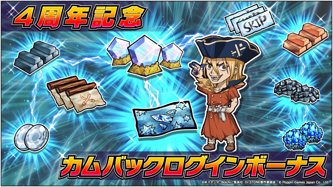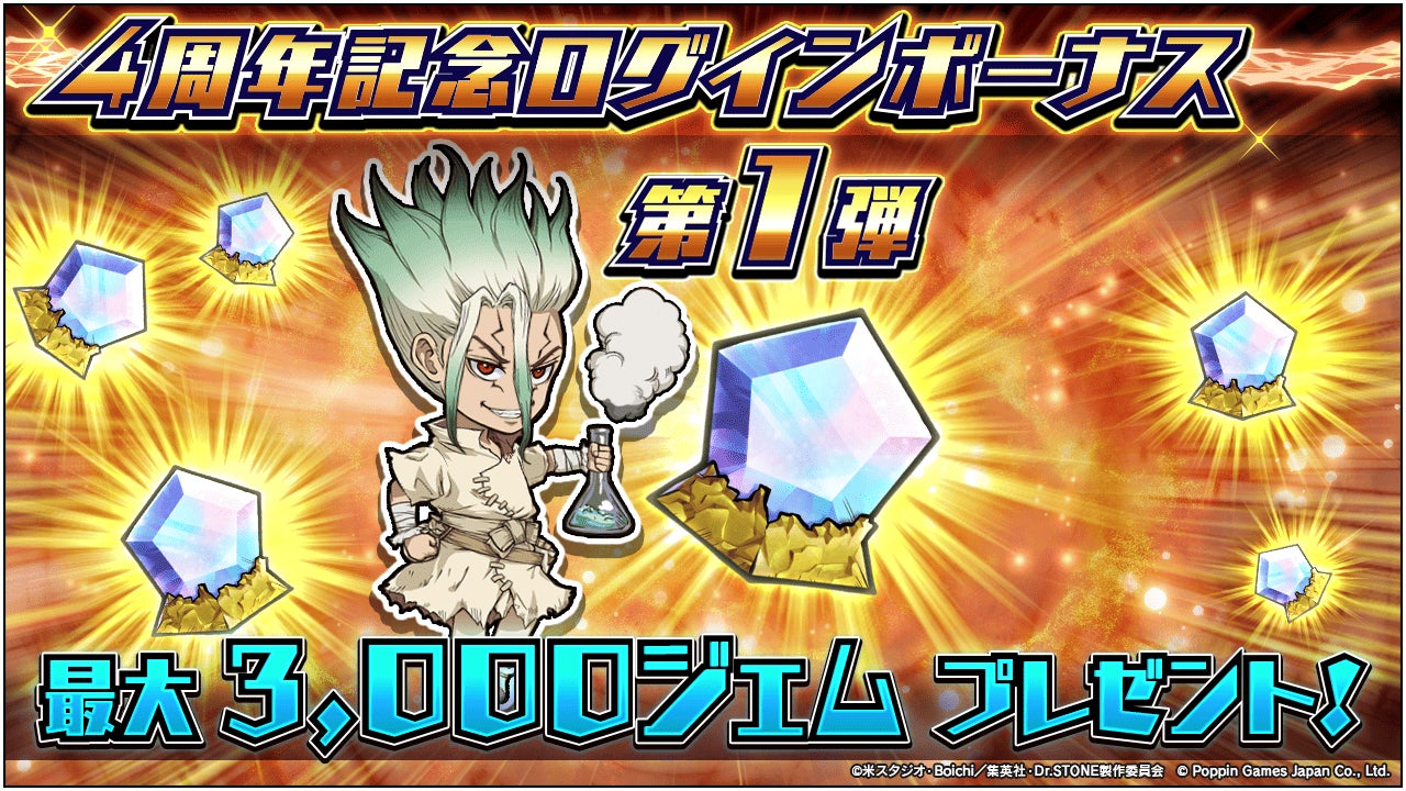 Dr.STONE バトルクラフト4周年記念!最大3,000ジェムが貰える「ログインボーナス」など4周年を記念したキャンペーンを開催!